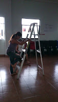 Construimos el acceso a la plataforma con una escalera de aluminio. La escalera deja de ser escalera, y los escalones dejan de ser escalones. Comenzamos a construir un ambiente en el que pueda verse colgar una horca a la luz de la luna.